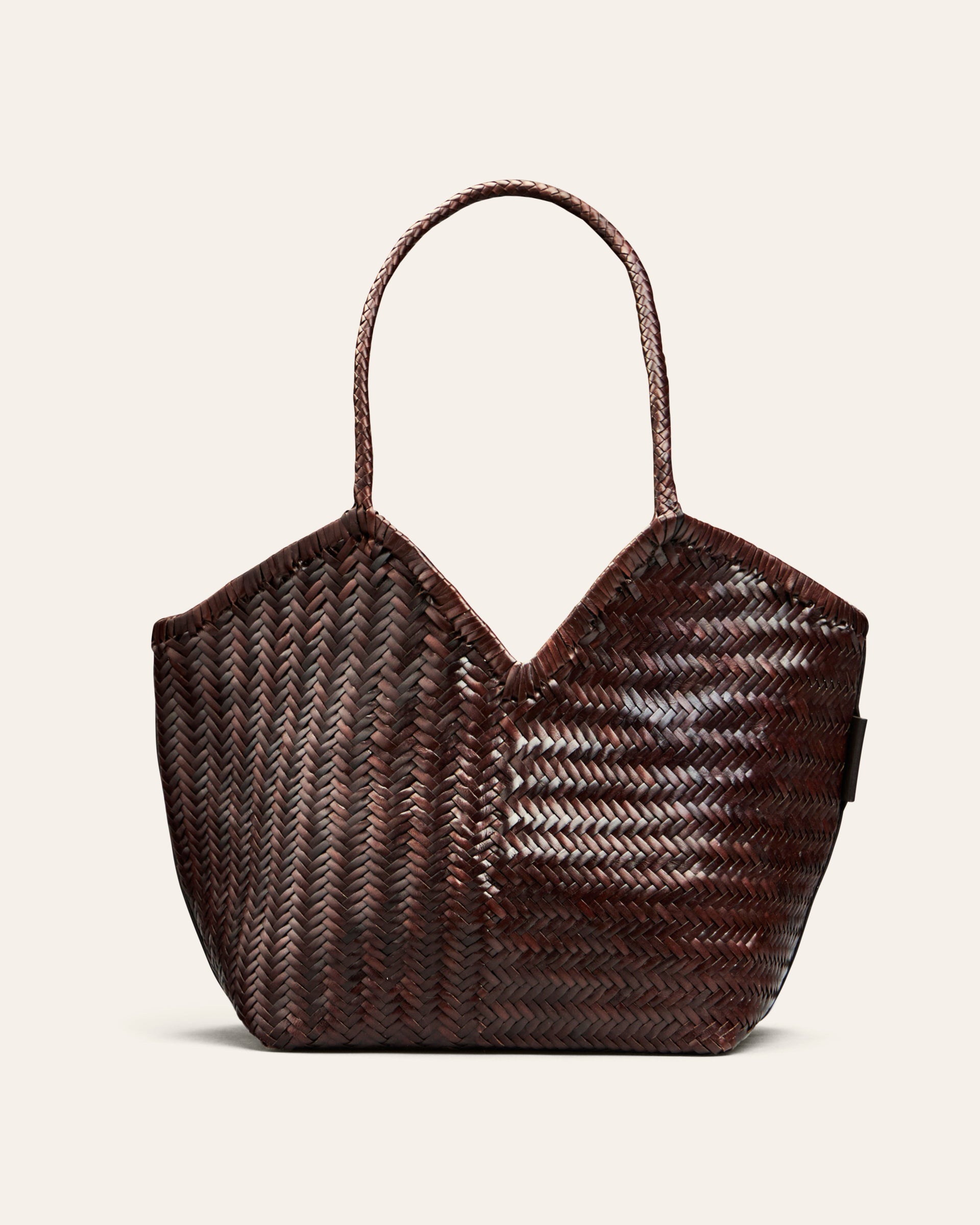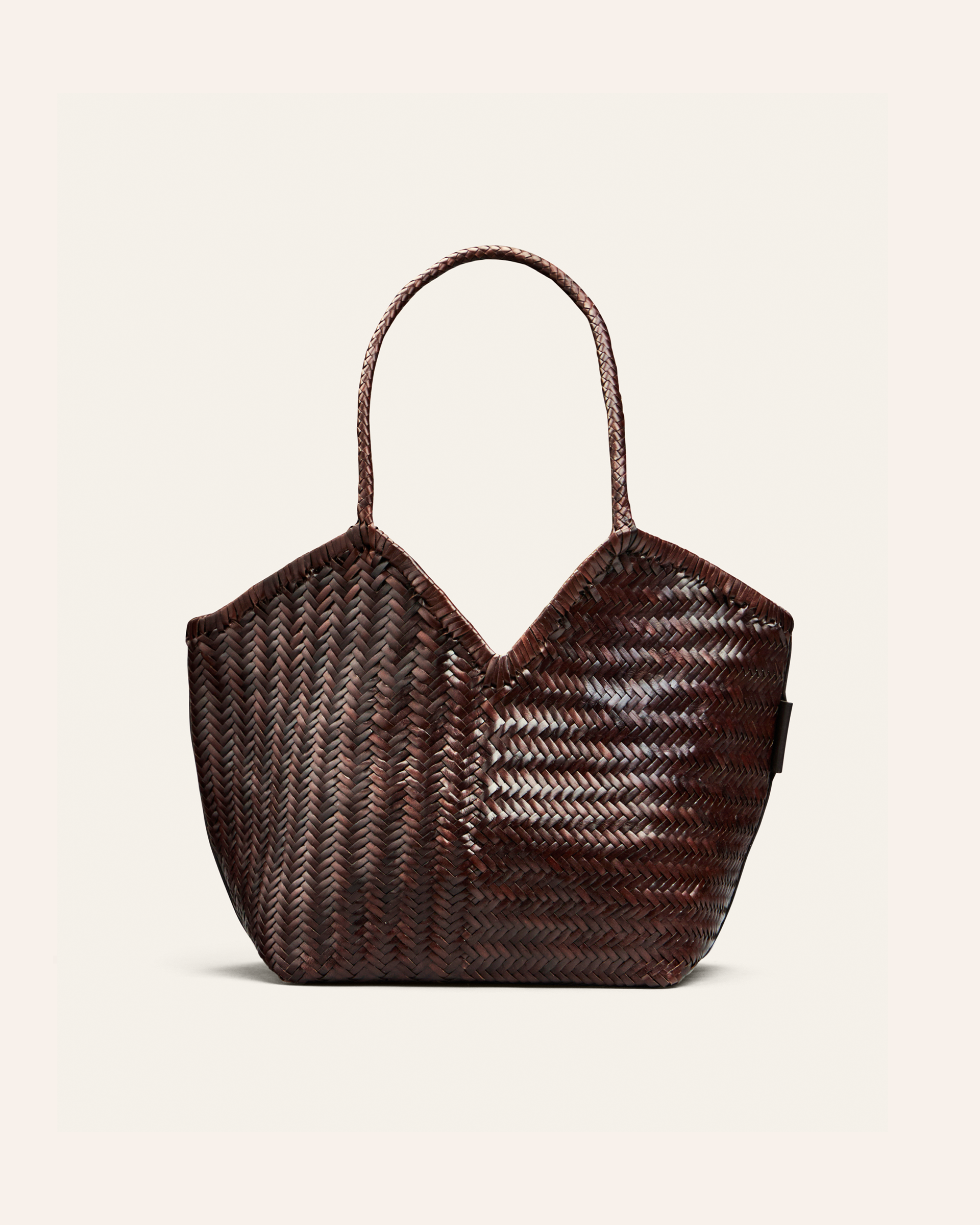 HUMI is a roomy leather tote made to be a practical choice for work, travel, or everyday errands. Handwoven from buffalo leather, it comes in two sizes and various color options. It features a v-shaped cutout on top, and slender handles for a comfortable fit on the shoulder.
